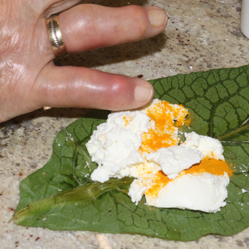 Die wohltuend kühlende Wirkung kann durch die Verwendung von Topfen noch verstärkt werden. Auf das Blatt aus dem Kühlschrank je nach Größe der zu behandelnden Stelle 1-3 EL Topfen aufstreichen. Wer möchte kann auch noch etwas Kurkuma Pulver sowie Beinwell- oder Arnika-Tinktur auf dem Topfen vereilen. Blatt nun möglichst straff um die zu behandelnde Stelle legen (Topfen innen) und mit einem Baumwolltuch abdecken.