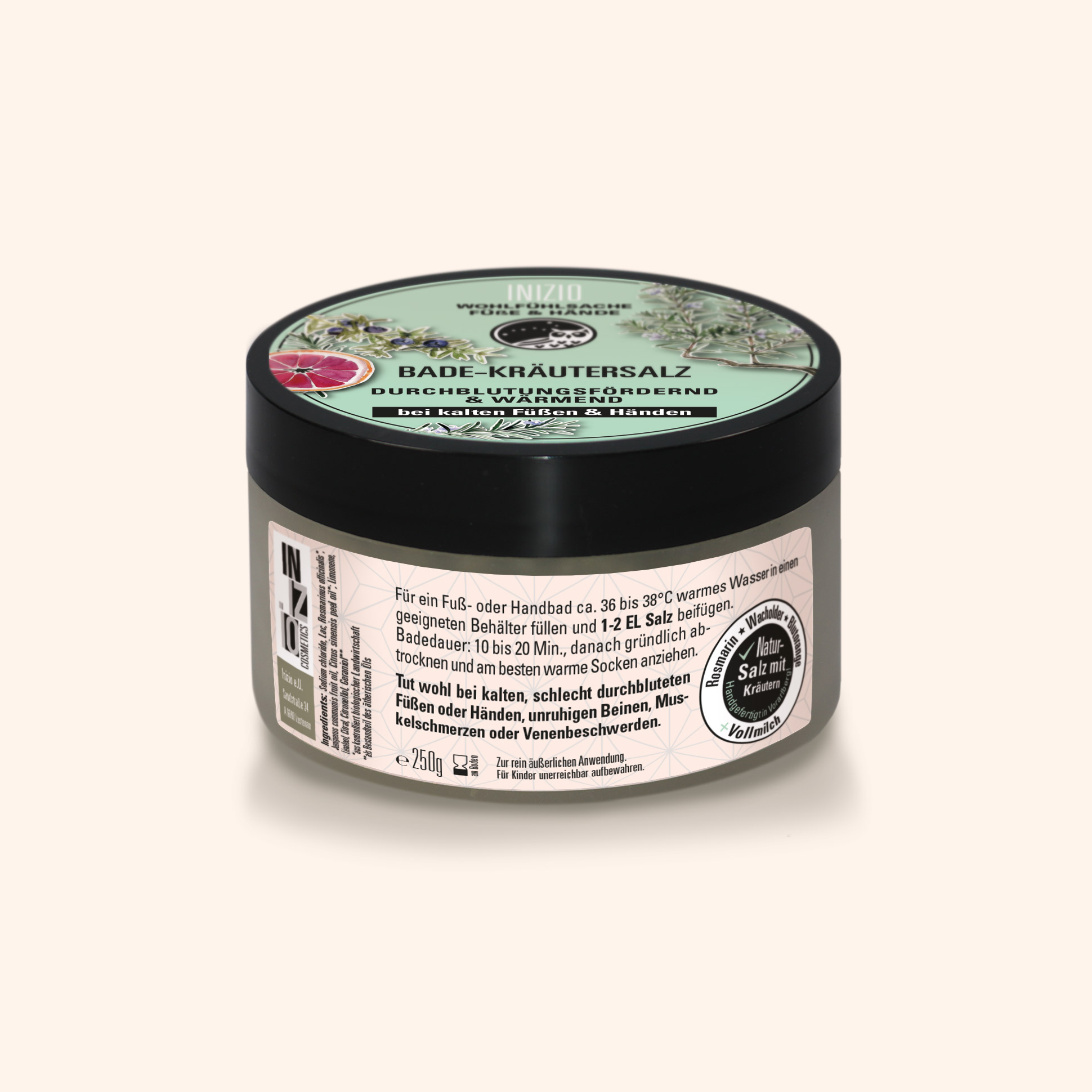 Bei Inizio ist jeder Inhaltsstoff ein Wirkstoff, der in der einzigartigen Rezeptur eine wichtige Funktion übernimmt. Auf Mineralöl und günstige Füllstoffe wird ganz bewusst verzichtet. Dieses Produkt besteht aus Natursalz mit Kräutern (die lateinischen Bezeichnungen laut Kosmetikrichtlinie finden Sie im Reiter „Inhaltstoffe“):