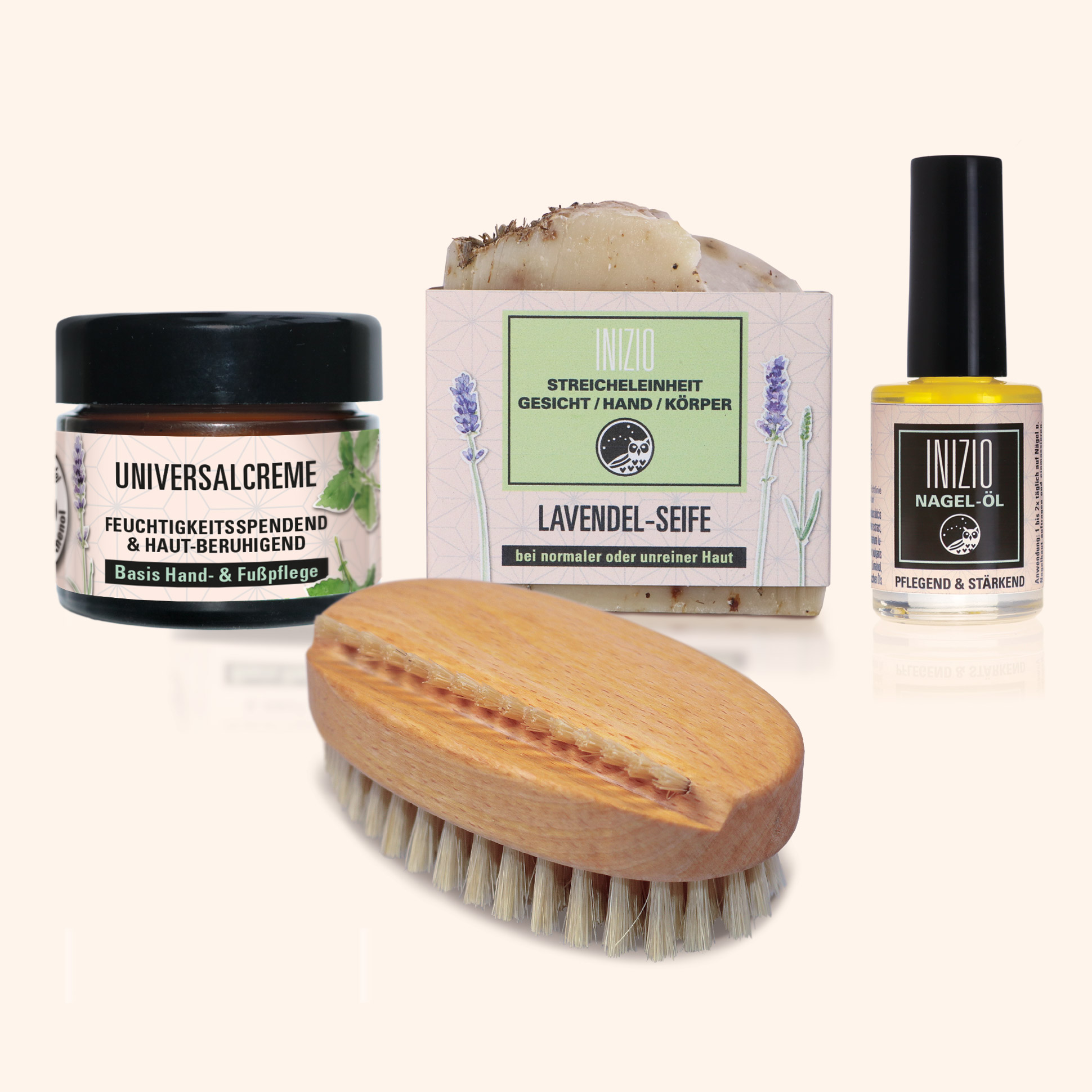 Unsere Hände sind meist stark beansprucht und neigen dazu, trocken und spröde zu werden. Gerade deshalb sind die rückfettenden, feuchtigkeitsspendenden Für-Dich Reinigungs- und Pflegeprodukte mit den Phytowirkstoffen aus Melisse und Lavendel, intensiv pflegenden Pflanzenölen, reichhaltiger Sheabutter und antibakteriell wirkenden ätherischen Ölen die beste, ganz natürliche Basis für gepflegte, zarte Hände. Das Nagelöl aus natürlichen Pflanzenölen ist die perfekte Ergänzung zur stärkenden Pflege des Nagelbettes und der Nägel. Zur flächigen Reinigung von verschmutzten Händen und Füßen sowie zur gezielten Reinigung unter den Nägel ist eine Nagelbürste im Set enthalten – perfekt für die Reinigung von auch einmal stärker verschmutzten Händen.