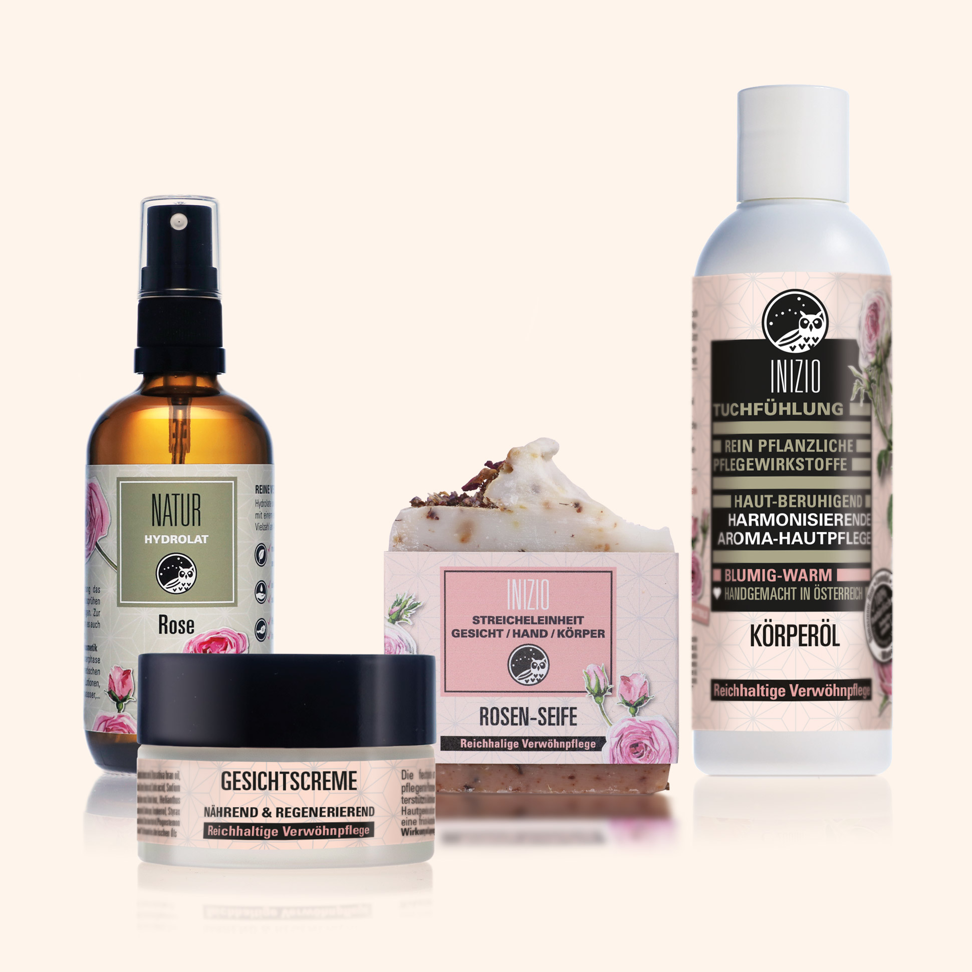 Das Kombipaket beinhaltet die idealen Produkte für die tägliche, verwöhnende Gesichts- & Körperpflege. Die Wirkstoffe der Rose wirken dabei harmonisierend, tonisierend und stärkend – egal ob zur Klärung und Erfrischung der Haut mit dem Hydrolat, zur reichhaltigen Gesichtspflege, zur Aroma Hautpflege für zarte, weiche Haut – ganz ohne Emulgatoren oder künstliche Inhaltsstoffe – oder zur Massage nach einem anstrengenden Tag verwendet werden.